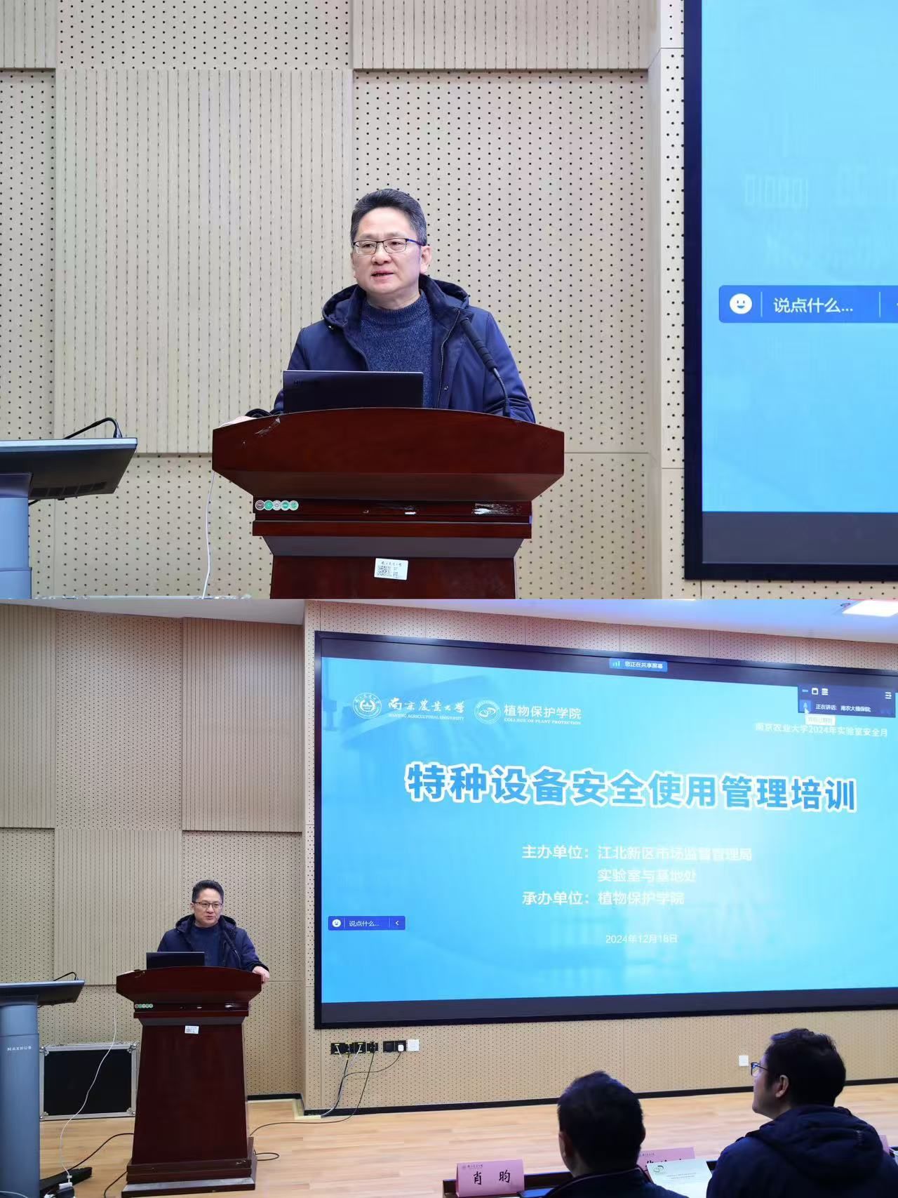 和新区的发展都至关重要,要落实安全主体责任,提升管理水平和风险防范意识,为高质量发展筑牢安全防线。随后,南京市锅炉压力容器检验研究院曹明和南京市特种设备安全监督检验研究院肖昀分别就压力容器和电梯等特种设备安全使用管理进行了培训,并深入解读了相关法律法规以及安全标准,指导参会人员如何依法依规落实特种设备管理责任。最后,两位培训老师耐心回答了师生提出的问题,参会人员就培训内容开展了热烈讨论。