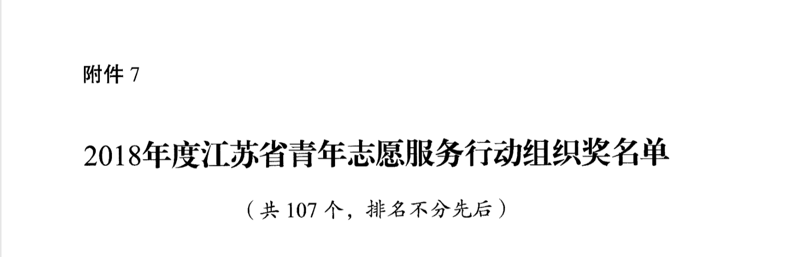荣获“2018年度江苏省青年志愿服务行动组织奖”称号。