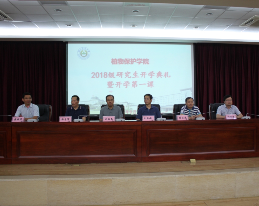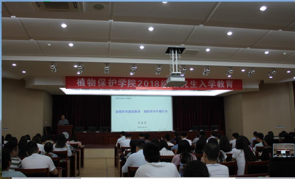 全体领导、教师代表、研究生辅导员、研究生秘书出席,2018级全体研究生参与。会议的第一阶段:王源超院长首先为研究生新生介绍了植保院的悠久历史以及当下的杰出发展,增强同学们的认同感和荣誉感,激励新生在未来的科研工作中,通过自身的努力和智慧继续为南农植保增光添彩;其后,党委书记吴益东教授以“加强学术规范教育,预防学术不端行为”为主题对新生进行学术道德教育,列举了各类学术不端行为,并以“韩春雨事件”作为典型案例,敬告各位研究生新生“就算大环境不容乐观,也不能成为学术不端的借口”;最后,教师代表韩召军教授则向新生们传授了科学研究方法,其中包括如何选题、如何书写项目申请报告等干货,使听众受益匪浅。会议的第二阶段:由研究生秘书岳丽娜老师和研究生辅导员李子成老师,分别向新生解读研究生学制和培养计划,以及研究生行政工作机制,解决新生当下最关注的问题,帮助他们尽快融入研究生阶段的生活。