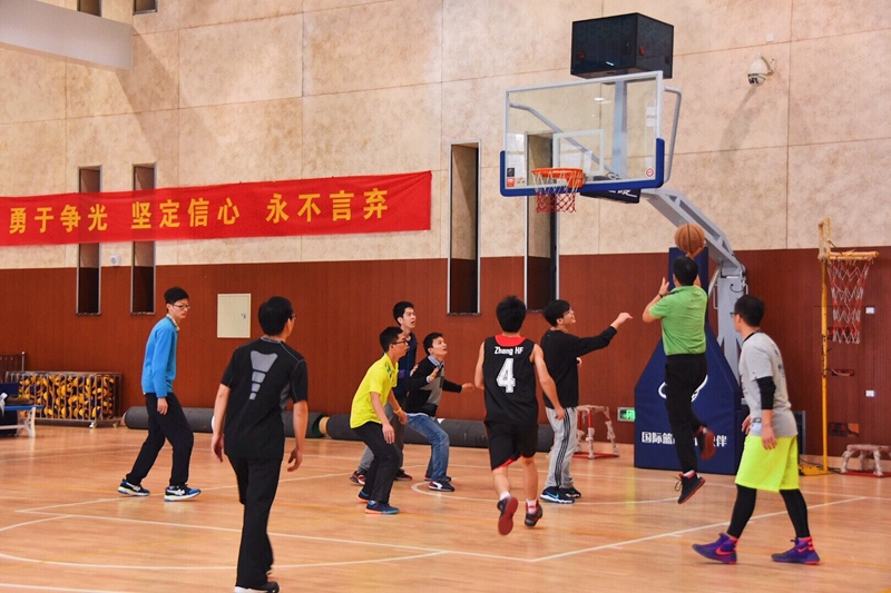 裁判的哨音刚落,参赛队员如离弦的箭般冲了出去,激烈的比赛开始了。球权转换间,143班球员们以高效的进攻与稳妥的防守迅速将比分拉到16:4,暂时领先教师队。比赛第二节院长王源超的上场瞬间将全场的气氛推向高潮。教师们不管是出色的配合,还是“孤身一人”控球突破都让场下观众惊呼叫好,同时老师们的速度、技巧一点都不输于年轻的学生们。比赛甚是精彩,场面极其激烈。最后王院长以一记漂亮的三分结束比赛,教师以精湛的球技与巧妙的配合反败为胜,以64:60的优势赢得比赛。