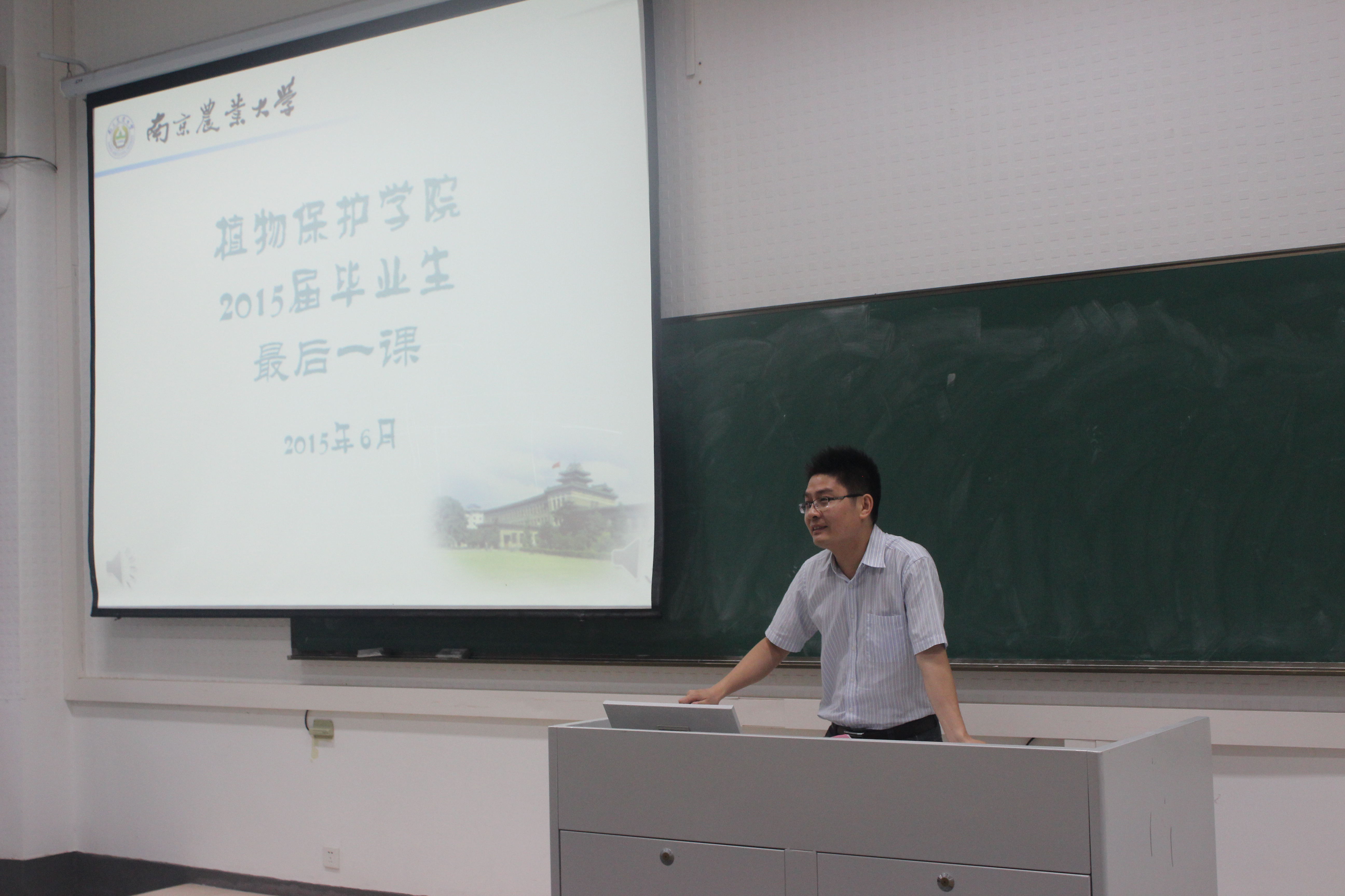 2015届毕业生最后一课在主楼134开讲,本次活动由植保院2015届毕业生临时党支部策划组织。植保院副院长、昆虫系教授刘泽文,昆虫系教授洪晓月,植物病理学教授窦道龙,植物病理学教授李红梅,副教授钱国良担任嘉宾出席课堂,院党委副书记黄绍华主持最后一课,亚洲色吧