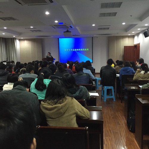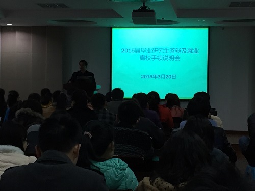 研究生分会主办的2015届毕业研究生答辩及就业离校手续说明会在理科C303举行。院党委副书记黄绍华、研究生辅导员吴智丹、研究生教务秘书岳丽娜为应届毕业生们带来了详尽实用的“毕业攻略”。 黄书记侧重于介绍今年的招聘情况,“求职攻略”告诫大家不要眼高手低,把握好方向,农业起薪虽然较其他行业偏低但努力工作也会有很好的前景。同时,黄书记还鼓励大家自主创业,响应两会号召,表示只要有好的创业或基层项目,亚洲色吧