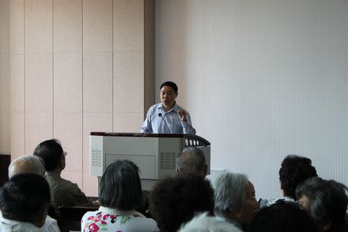 学术报告厅济济一堂,在校庆110周年前夕,植保62届校友六十多人欢聚母校喜迎校庆,共叙毕业五十年来的友情。