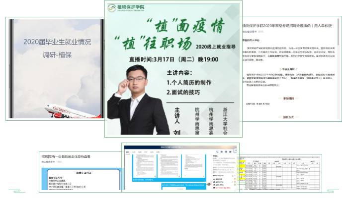 了解全体毕业生情况,全院266名毕业生已完成《2020届毕业生就业情况调研-植保》;全过程指导,针对经济困难、滞留湖北、暂未签约学生开展“一对一”服务,打通研究生培养的最后一公里;全方位投入,校企密切合作、家校密切联系、全媒体宣发就业信息。现已联系50余家对口企业参加校园春季招聘会,邀请企业HR开设简历制作、面试技巧等就业指导直播课,通过QQ群、微信群和公众号宣传就业信息、开展就业指导、邀请用人单位。