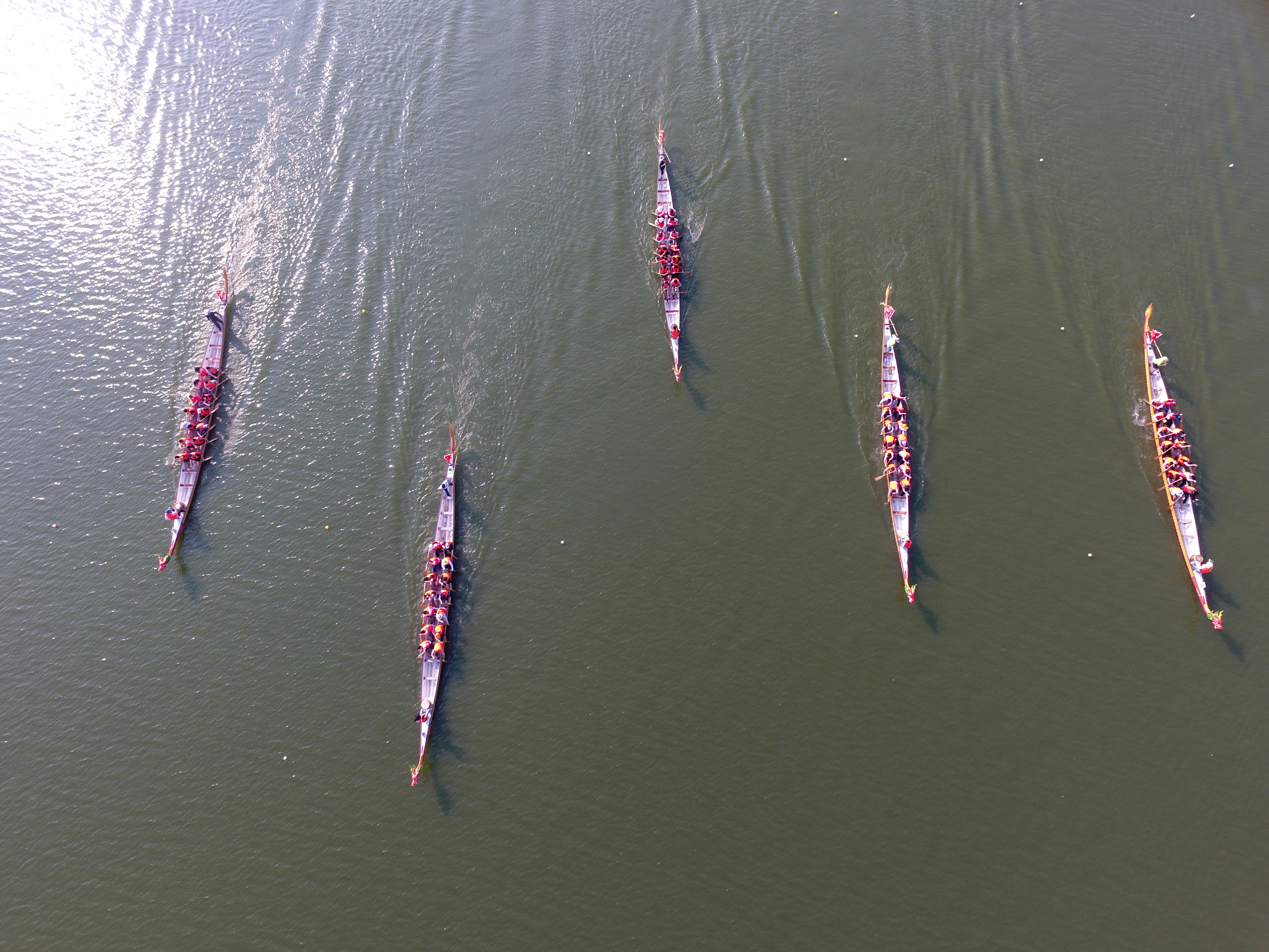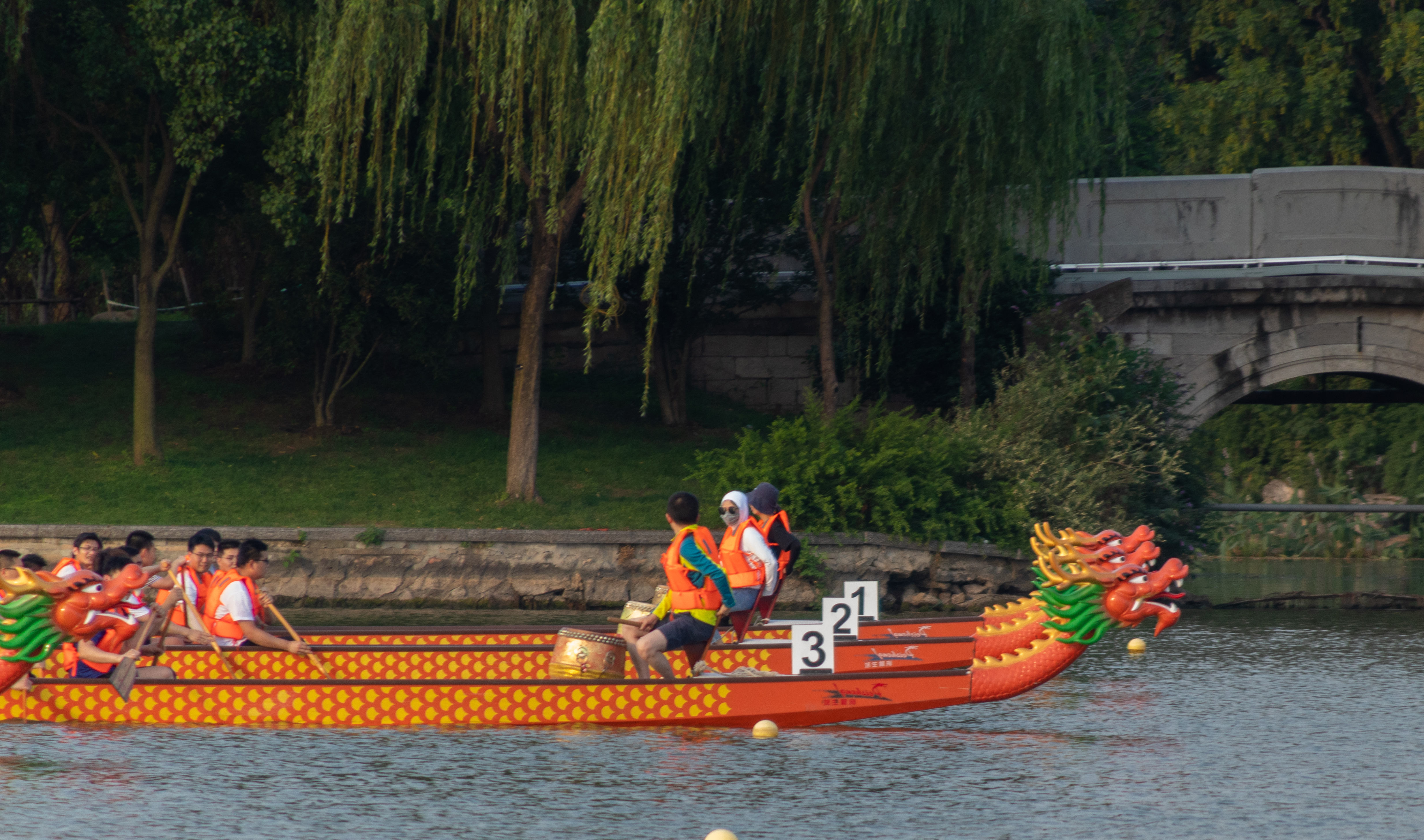 随着比赛开始的一声令下,激昂的鼓声、整齐的口号声同时响彻于湖面,蓄势待发的参赛队员们奋力划桨、劈波斩浪、勇往直前,龙舟队伍你追我赶、全速前行。岸上的啦啦队挥舞呐喊,加油声此起彼伏。湖中岸上,交相辉映,一片欢腾。