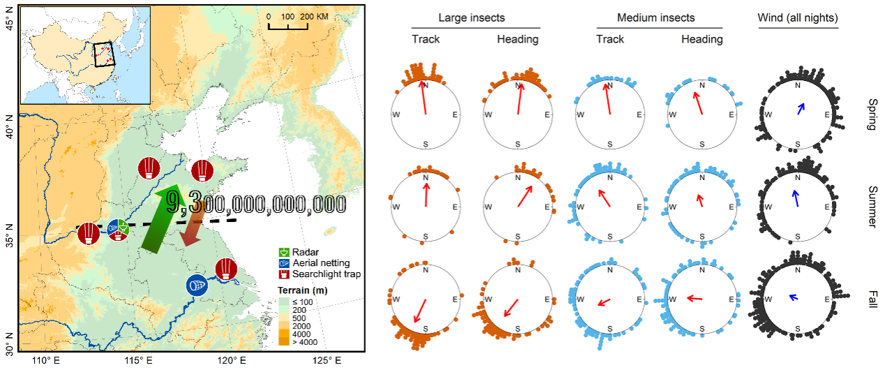 胡高教授团队与河南农科院封洪强研究员团队的合作研究成果《Massive seasonal high-altitude migrations of nocturnal insects above the agricultural plains of East China》。该研究成果揭示了我国东部地区夜间迁飞昆虫空中数量规模以及迁飞行为模式。