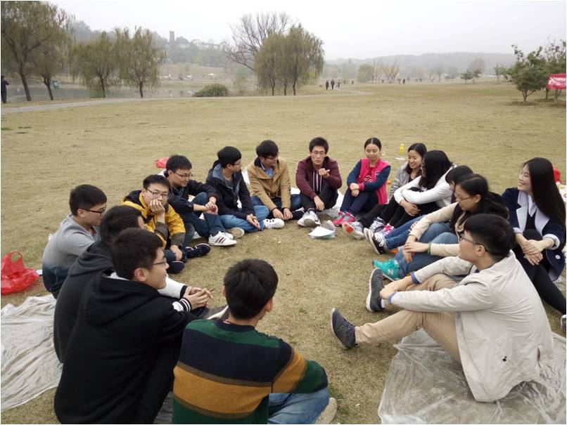 十一月的南京,落叶纷纷,硕果飘香,正是秋游的好时光,云淡风轻的天气无疑让这次秋游增添了许多愉悦的心情。河畔边,小伙伴们各自组队,自我介绍之后便开始了热闹的游戏。首先进行的是“击鼓传花”,班长在气球中放入写有奖励或者惩罚的小纸条,吹足气球,大家围成一个圈,当敲鼓的音乐响起时开始传递气球,音乐停止时气球在谁手中就要扎破气球,接受奖励或者惩罚。一、两轮过后,彼此之间越来越熟悉,也越来越放得开,欢声笑语中,大家玩的不亦乐乎。之后,同学们还积极踊跃地进行了“解套”、“杀人游戏”等活动,增加了秋游的趣味性。