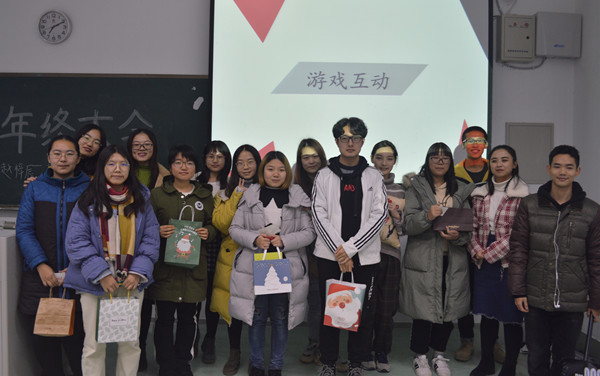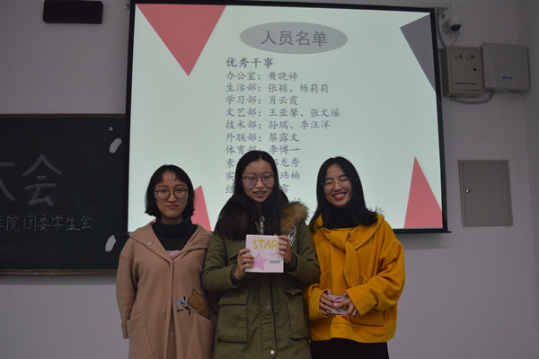 大会开始前,投影屏幕上放出了学生会各部门成员的个人介绍,引发了阵阵欢笑。大会开始,欧阳雪与大家回顾了各部门一年来的付出和成果,对学生会全体同学表示了感谢。随后,欧阳雪宣读了本学期学生会优秀干事与志愿者名单,主席团成员和部长为获奖同学颁奖。之后的抽奖环节中,几位幸运的同学得到了资环复印室VIP卡。游戏环节里,同学们也是欢笑不断,击鼓传花,你画我猜;在一轮轮游戏过后,同学们不仅拿到了小零食奖品,彼此之间也变得亲近起来。