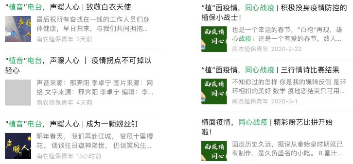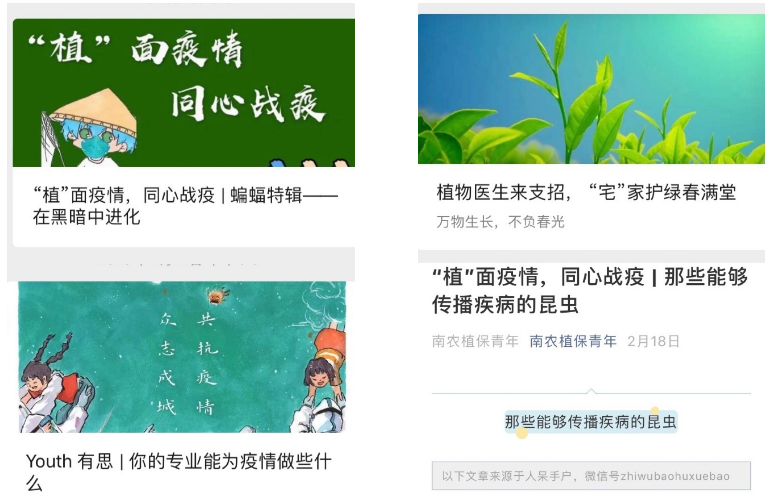 微信平台“南农植保青年”开辟“植”面疫情,同心战“疫”、“植音”电台,声暖人心、鼠你健康专栏,做好疫情防控网络宣传,加强舆论引导。累计发布推送50余条,总阅读量超过17000次,获微信平台“亚洲色吧
