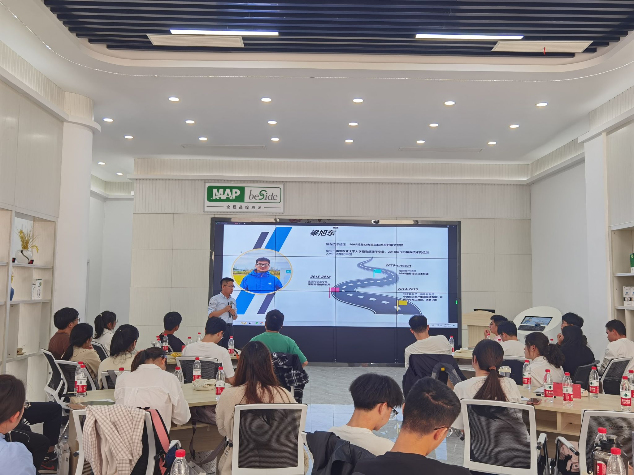 在校企交流环节,MAP与数字农业人力资源部副总监游会静宏观介绍MAP与数字农业的使命、愿景、核心理念及业务模块,鼓励青年学生学农为农、为中国农业现代化贡献智慧和力量。MAP粮作苏皖省区总经理助理李云飞详细介绍MAP BU业务及战略,MAP粮作苏皖省区人力负责人陈默具体介绍公司岗位及人才发展理念。同学们也就校招等问题与公司负责人交流。