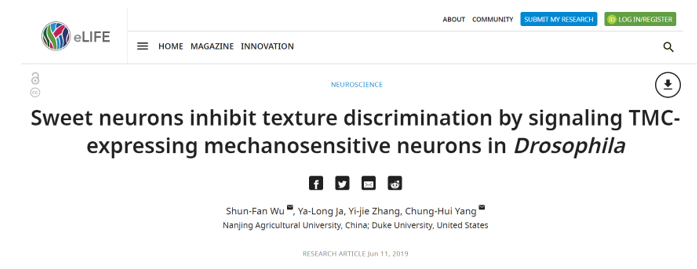 研究论文“Sweet neurons inhibit texture discrimination by signaling TMC-expressing mechanosensitive neurons in Drosophila”于2019年6月11日以长文形式出版在eLife杂志。吴顺凡博士是论文的第一作者和共同通讯作者,杜克大学Yang Chung-Hui博士是论文的共同通讯作者,植保院硕士生贾亚龙和博士生张伊杰也参与了部分工作,亚洲色吧