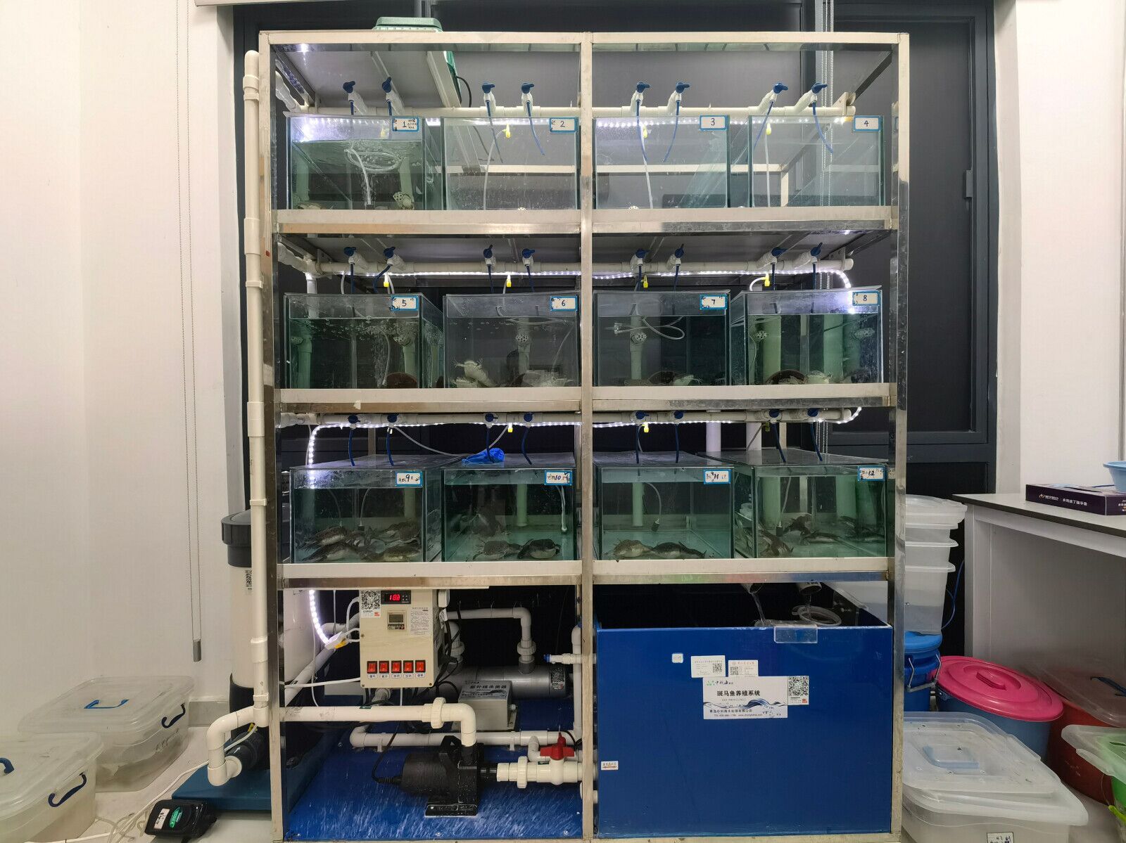 系统由不锈钢架、玻璃培养缸、循环水泵、紫外线消毒器、净水过滤器、温度及光照控制元件组成,可自动监控电导率、酸碱度以及自动调节温度和光照时间等。