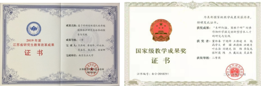 植物保护专业2007年入选国家级特色专业;2014年入选教育部卓越农林人才培养计划改革试点项目;2015、2020年连续两期入选江苏省品牌专业建设项目;2017年首批通过教育部农科类第三级专业认证;2018年入选首批全国党建工作标杆院系建设单位;2019年入选首批国家一流专业建设点;先后获得国家级教学成果一等奖1项、二等奖3项; 2011年起连续三期入选江苏省优势学科建设工程,在第四轮学科评估中获评A+。人才培养充分发挥学科优势,深入推动科教融合,构建了“本研衔接、寓教于研”的创新人才培养模式,形成了“教学促进科研、科研反哺教学”共同前进的良好态势,人才培养质量持续提升。